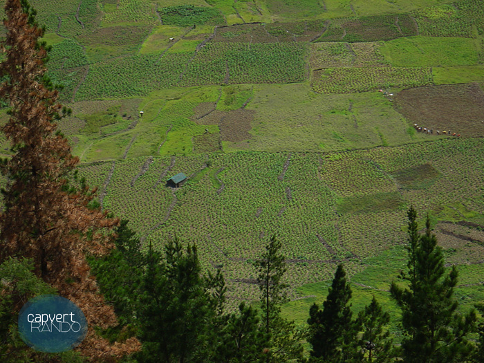 Notre conducteur nous dépose à l'intérieur d’un ancien cratère où les cultures forment une étonnante marqueterie dans tous les tons du vert.
